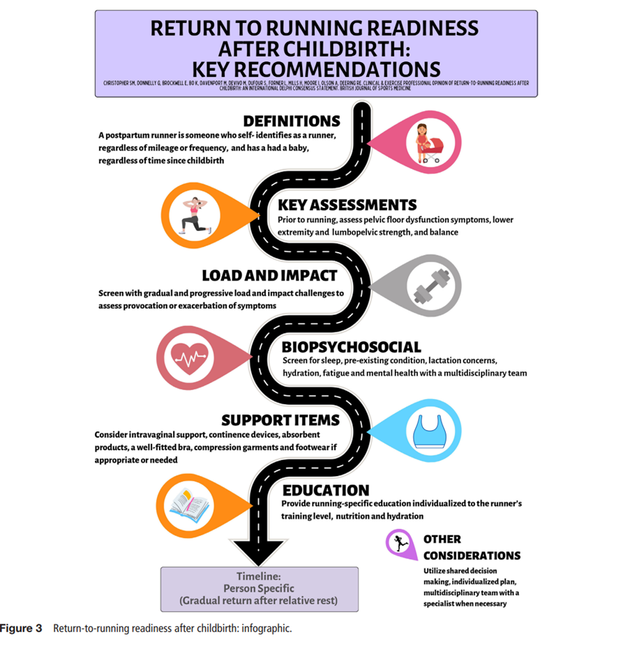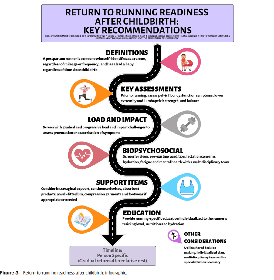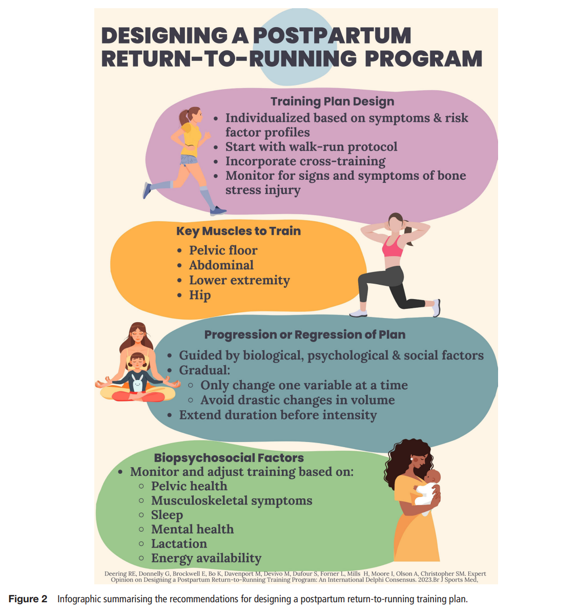 Deering, R. E., Donnelly, G. M., Brockwell, E., Bø, K., Davenport, M. H., De Vivo, M., Dufour, S., Forner, L., Mills, H., Moore, I. S., Olson, A., & Christopher, S. M. (2024). Clinical and exercise professional opinion on designing a postpartum return to running training program: An international Delphi study and consensus statement. British Journal of Sports Medicine, 58, pp183–195.